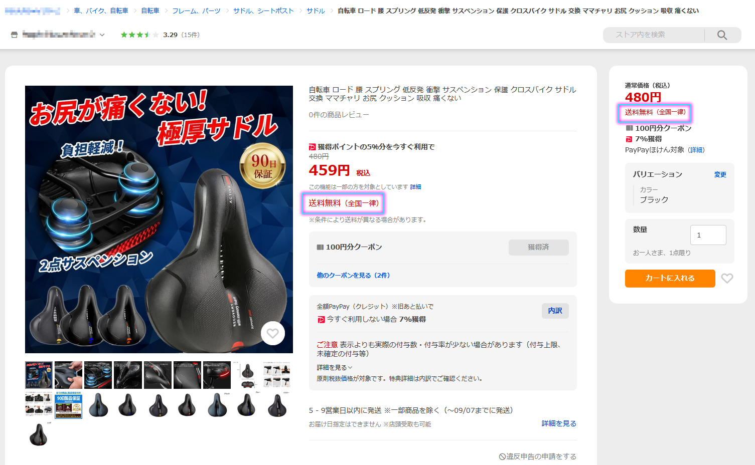 今回も「送料無料」の条件で 自転車のサドル を探していました。